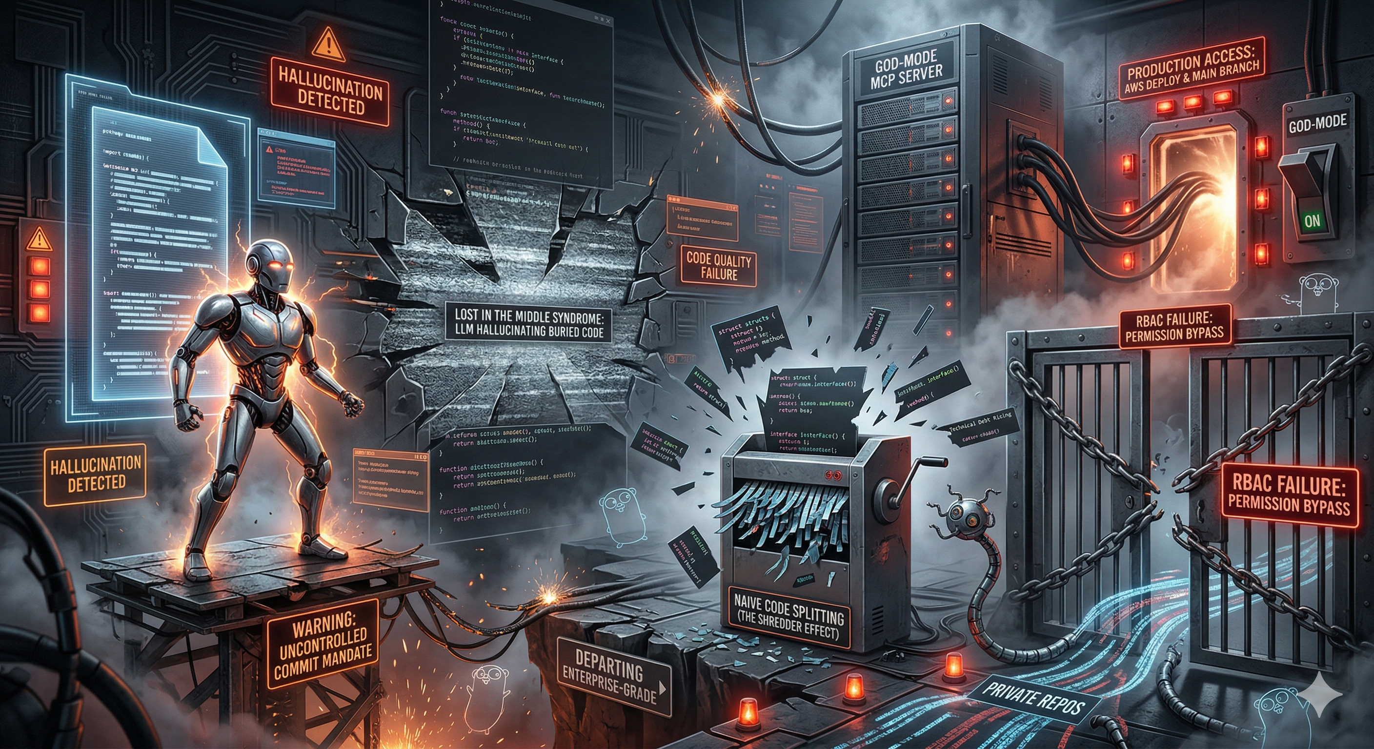 : Cutting Go code blindly by character count to fit into a vector database is a disaster. If you slice a large struct definition in half, or separate a struct from its receiver methods, the AI loses all context. The Fix: Write logic in your ingestion pipeline to parse the Go Abstract Syntax Tree (usinggo/ast) so structs, interfaces, and methods are preserved as single, logical units in the database. - The God-Mode MCP Server: Because MCP makes it easy to expose infrastructure, the temptation is to build one giant server that has admin access to both GitHub and your AWS production environment. The Fix: Treat MCP servers like microservices. Scope them aggressively with least-privilege access. The server that reads Jira tickets must not be the same server holding the keys to merge to main.