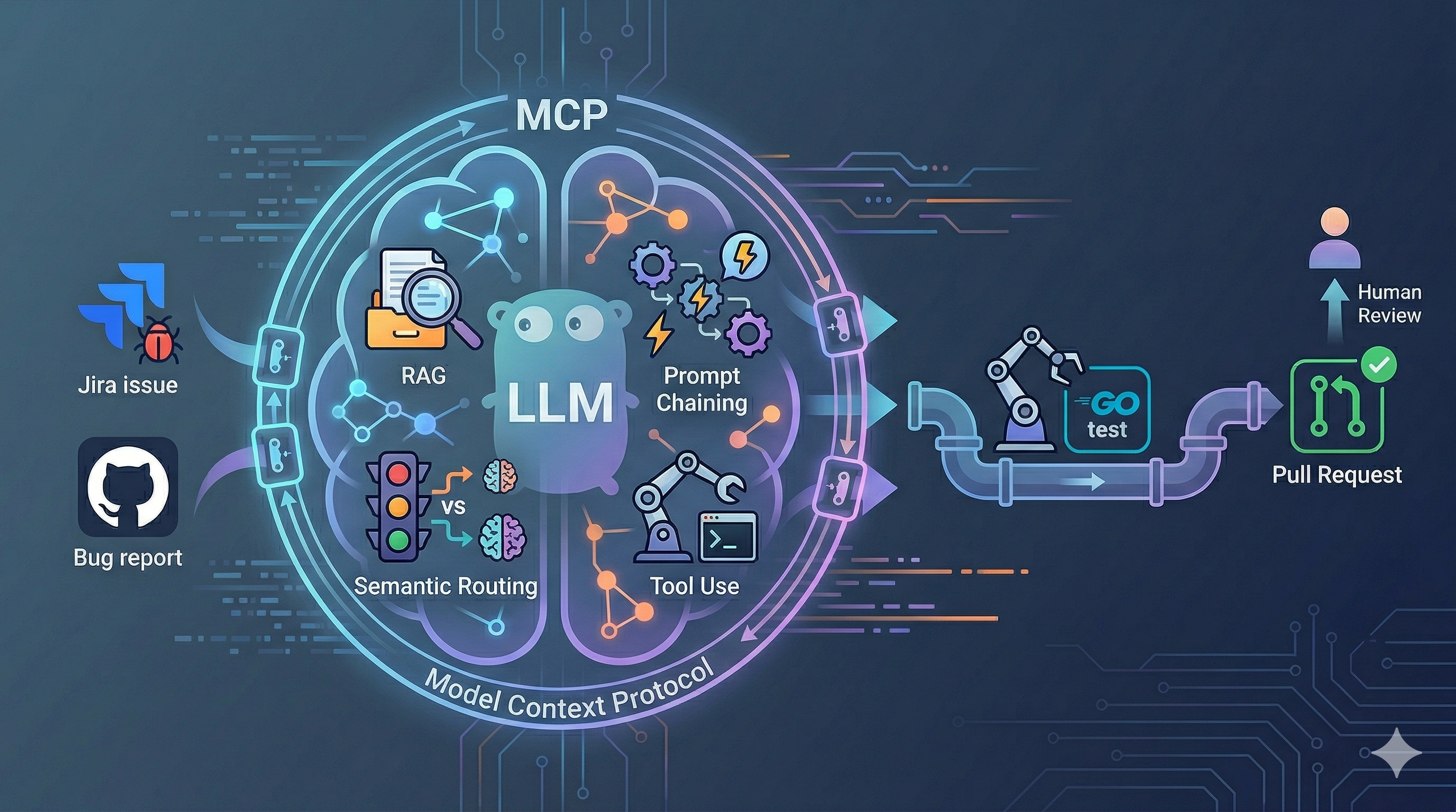 architecture where an AI ingests incoming Jira issues or GitHub bugs, investigates the codebase, writes the
